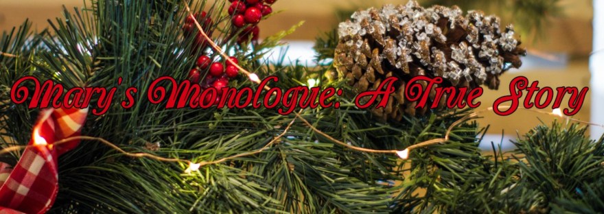 The stage was set. Lights dim. Heart pounding. Music playing. Head foggy. I was on after Joy to the World. Hands shaking. Parched throat. I closed my eyes. "There's no reason to be nervous. You can say the lines in your sleep. And if you fall flat on your face, mom will give a standing ovation… Continue reading Mary’s Monologue : A True Story